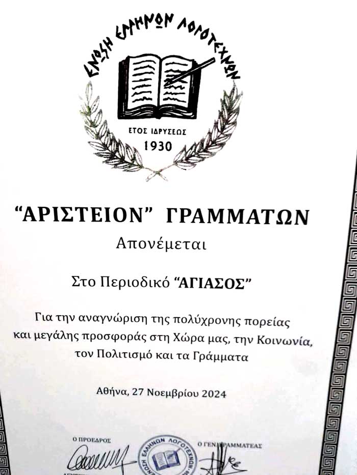 Με περηφάνεια πληροφορούμε τα μέλη και τους φίλους του Φιλοπρόοδου Συλλόγου Αγιασωτών ,ότι η Ένωση Ελλήνων Λογοτεχνών με πρόταση του Προέδρου του Σωματείου κ. Λευτέρη Τζόκα και με απόφαση του Δ.Σ. επέλεξε να βραβεύσει με το «Αριστείον Γραμμάτων» το διμηνιαίο περιοδικό του Φιλοπρόοδου Συλλόγου Αγιασωτών , «ΑΓΙΑΣΟΣ» ,στα πλαίσια της βράβευσης εφημερίδων και περιοδικών Συλλόγων και φυσικών προσώπων ,που ακόμα αντιστέκονται και αποτελούν ανάχωμα πολιτισμού τους δύσκολους καιρούς που διαβαίνουμε, συνεχίζοντας την έκδοση .